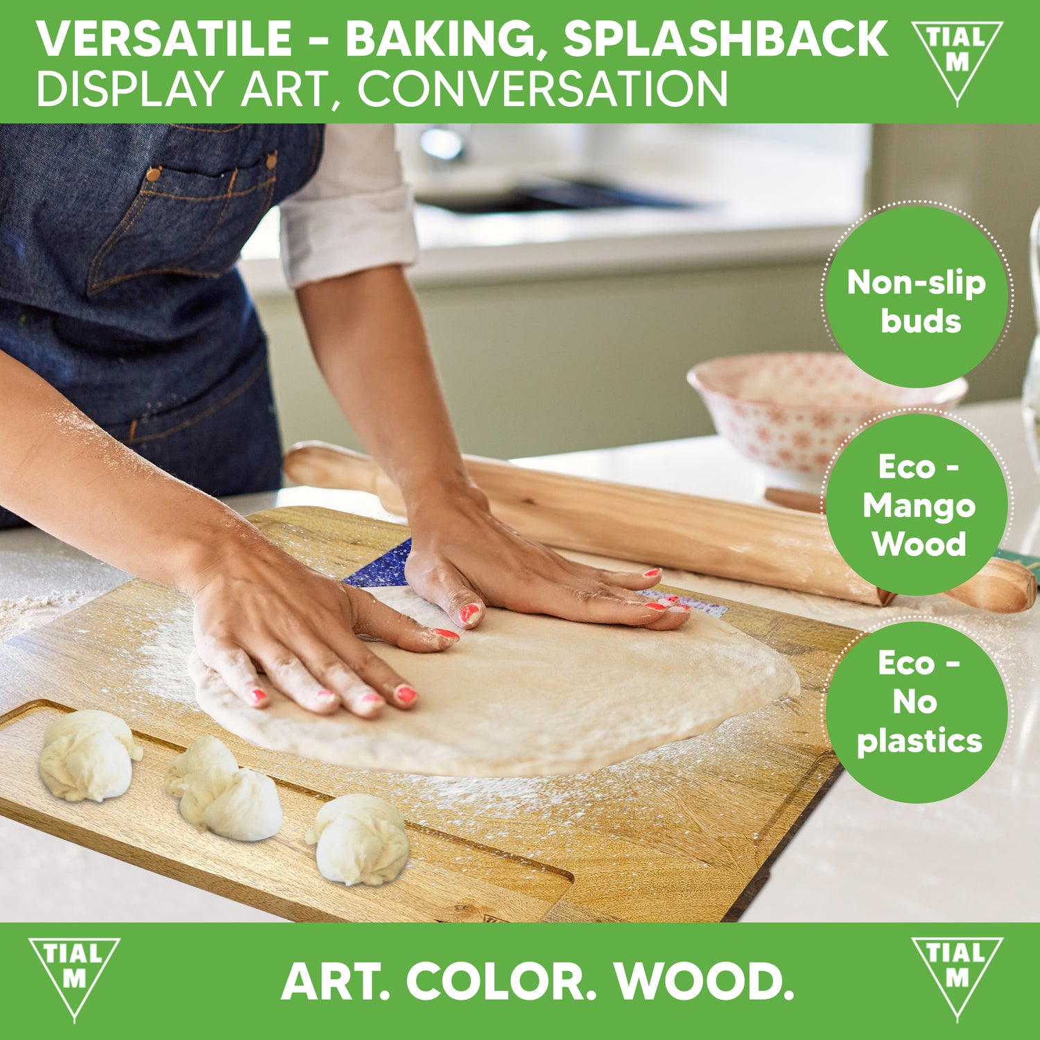 A great gift: cutting and serving; a cheese, charcuterie, crudités, antipasto, and bread board. Baking: -roll the pizza base. Then display and discuss as a splashback or stove cover